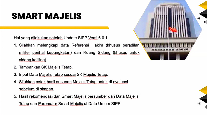 Jakarta – Mahkamah Agung (MA) melalui Badan Urusan Administrasi (BUA) menggelar sosialisasi daring pembaruan aplikasi Sistem Informasi Penelusuran Perkara (SIPP) versi 6.0.1.
