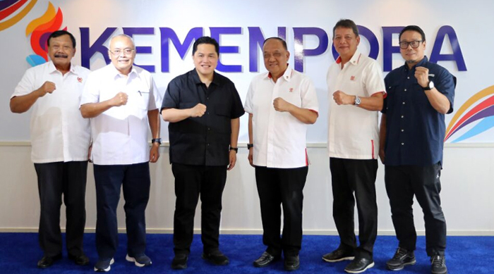 Jakarta – Ketua Umum Komite Olahraga Nasional Indonesia (KONI) Pusat Letjen TNI (Purn) Marciano Norman menyampaikan perkembangan persiapan Pekan Olahraga Nasional XXII 2028 kepada Menteri Pemuda dan Olahraga (Menpora) Republik Indonesia, Erick Thohir, pada Rabu (18/2).