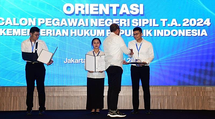 Hal ini dilakukan Wamenkum saat memberikan sambutan sekaligus memberi kuliah umum kepada seluruh CPNS yang hadir dalam Orientasi CPNS TA 2024.